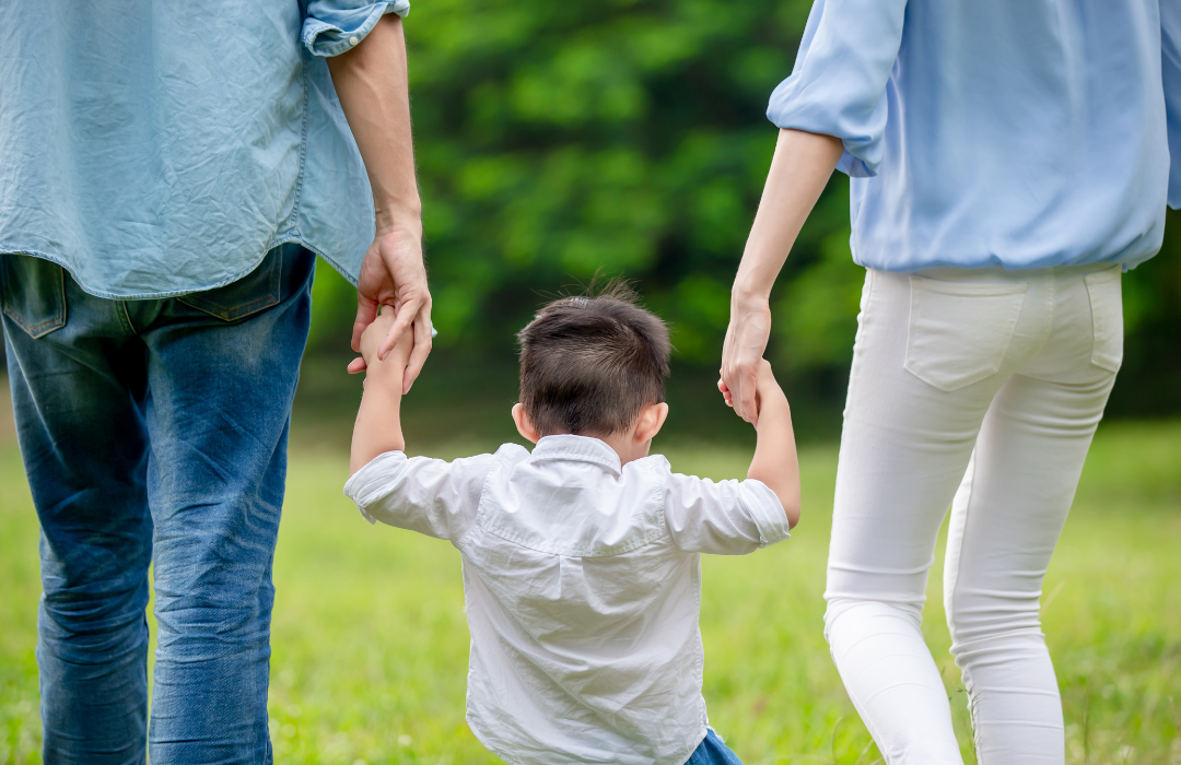 A young child walks between two adults, holding their hands in a sunlit green field—capturing a quiet moment of connection, guidance, and the early shaping of emotional patterns within a family.